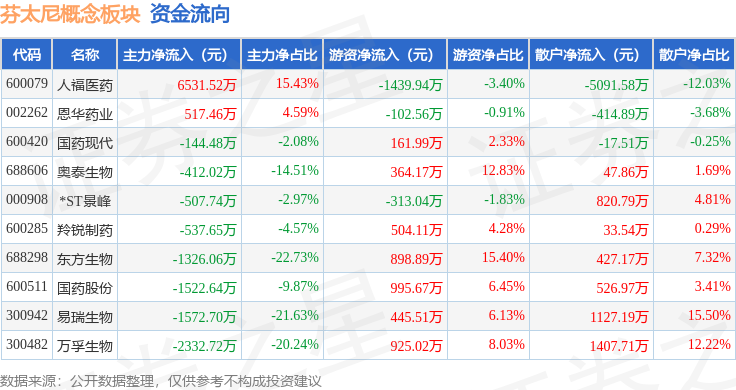 从资金流向上来看,当日芬太尼概念板块主力资金净流出1307.04万元,游资资金净流入2439.81万元,散户资金净流出1132.76万元。芬太尼概念板块个股资金流向见下表: