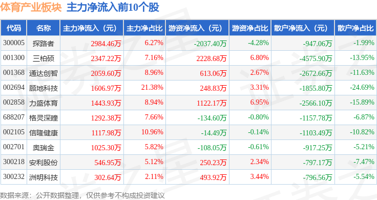 从资金流向上来看,当日体育产业板块主力资金净流出21.61亿元,游资资金净流入4.23亿元,散户资金净流入17.39亿元。体育产业板块个股资金流向见下表: