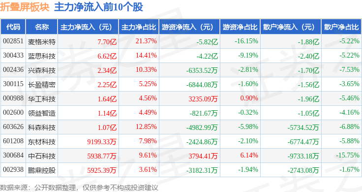 从资金流向上来看,当日折叠屏板块主力资金净流入17.9亿元,游资资金净流出11.05亿元,散户资金净流出6.86亿元。折叠屏板块个股资金流向见下表: