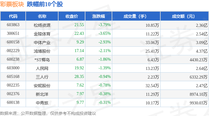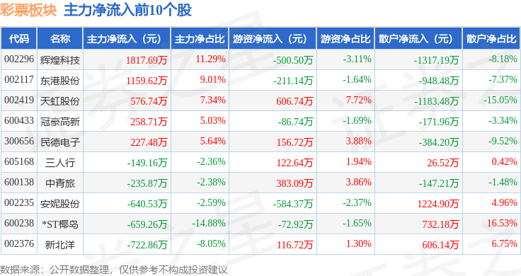 从资金流向上来看,当日彩票板块主力资金净流出2.29亿元,游资资金净流入5416.57万元,散户资金净流入1.75亿元。彩票板块个股资金流向见下表:
