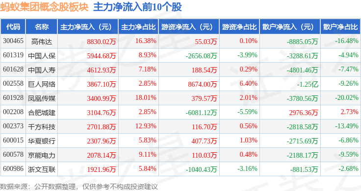 从资金流向上来看,当日蚂蚁集团概念股板块主力资金净流出7.38亿元,游资资金净流入8990.57万元,散户资金净流入6.48亿元。蚂蚁集团概念股板块个股资金流向见下表: