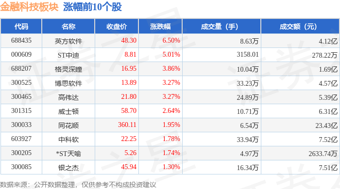 证券之星消息,11月6日金融科技板块较上一交易日上涨0.25%,英方软件领涨。当日上证指数报收于4007.76,上涨0.97%。深证成指报收于13452.42,上涨1.73%。金融科技板块个股涨跌见下表: