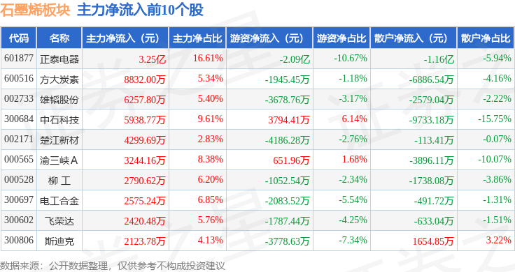 从资金流向上来看,当日石墨烯板块主力资金净流出8.31亿元,游资资金净流出1.39亿元,散户资金净流入9.71亿元。石墨烯板块个股资金流向见下表: