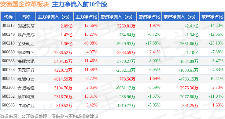 从资金流向上来看,当日安徽国企改革板块主力资金净流入3.51亿元,游资资金净流出5133.16万元,散户资金净流出3.0亿元。安徽国企改革板块个股资金流向见下表: