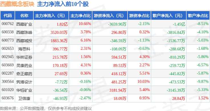 从资金流向上来看,当日西藏概念板块主力资金净流入1253.5万元,游资资金净流入2763.14万元,散户资金净流出4016.64万元。西藏概念板块个股资金流向见下表: