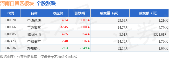 证券之星消息,11月6日河南自贸区板块较上一交易日上涨0.64%,中原高速领涨。当日上证指数报收于4007.76,上涨0.97%。深证成指报收于13452.42,上涨1.73%。河南自贸区板块个股涨跌见下表:
