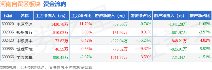 从资金流向上来看,当日河南自贸区板块主力资金净流入1070.79万元,游资资金净流入1631.5万元,散户资金净流出2702.29万元。河南自贸区板块个股资金流向见下表: