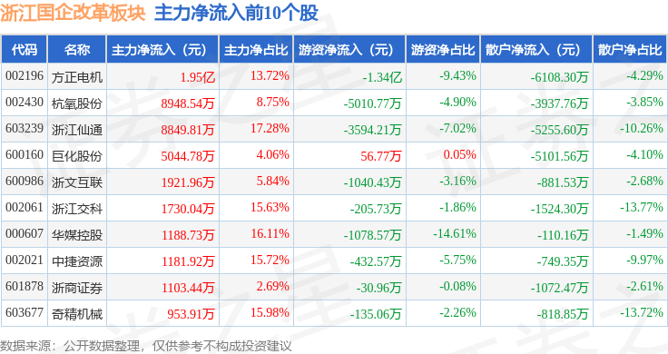 从资金流向上来看,当日浙江国企改革板块主力资金净流出3.29亿元,游资资金净流出2.11亿元,散户资金净流入5.4亿元。浙江国企改革板块个股资金流向见下表: