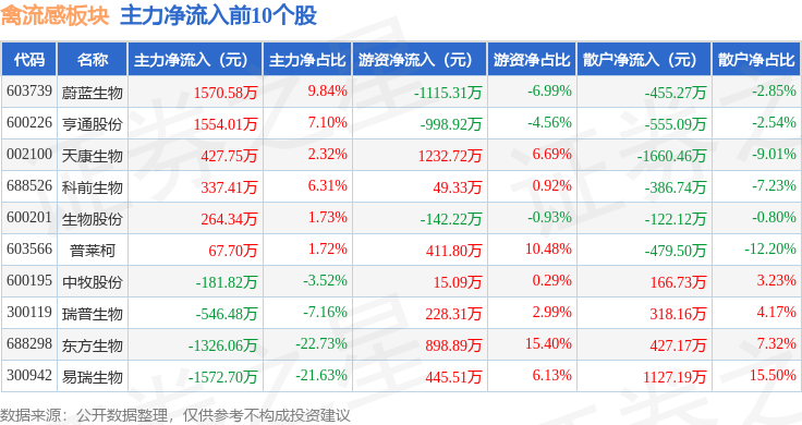 从资金流向上来看,当日禽流感板块主力资金净流出1700.2万元,游资资金净流入1665.82万元,散户资金净流入34.39万元。禽流感板块个股资金流向见下表: