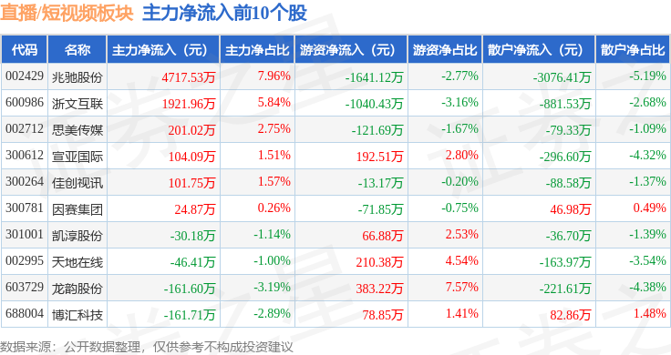 从资金流向上来看,当日直播/短视频板块主力资金净流出10.94亿元,游资资金净流入6683.51万元,散户资金净流入10.28亿元。直播/短视频板块个股资金流向见下表: