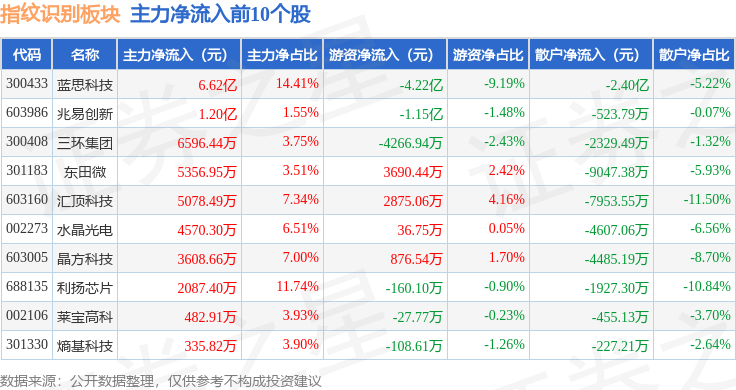 从资金流向上来看,当日指纹识别板块主力资金净流入5.31亿元,游资资金净流出3.79亿元,散户资金净流出1.52亿元。指纹识别板块个股资金流向见下表: