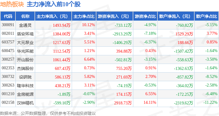 从资金流向上来看,当日地热板块主力资金净流出10.11亿元,游资资金净流入2.34亿元,散户资金净流入7.78亿元。地热板块个股资金流向见下表: