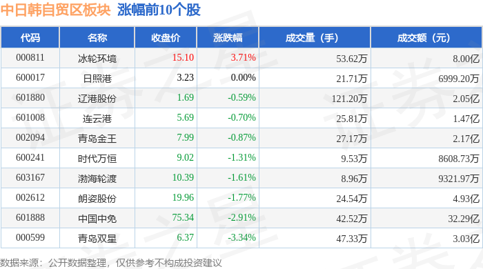 从资金流向上来看,当日中日韩自贸区板块主力资金净流出5.49亿元,游资资金净流入1.56亿元,散户资金净流入3.93亿元。中日韩自贸区板块个股资金流向见下表: