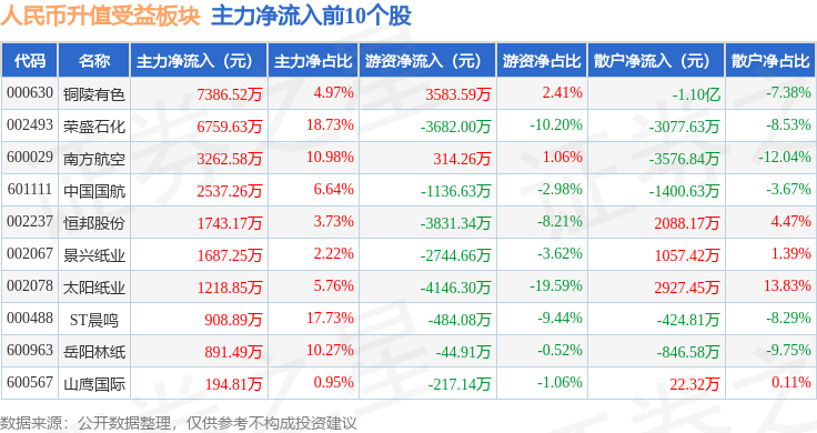 从资金流向上来看,当日人民币升值受益板块主力资金净流出5.59亿元,游资资金净流入1.35亿元,散户资金净流入4.24亿元。人民币升值受益板块个股资金流向见下表: