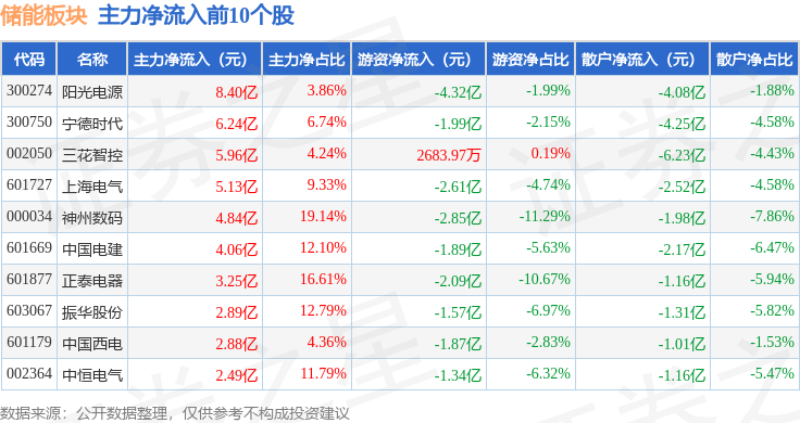 从资金流向上来看,当日储能板块主力资金净流入5.3亿元,游资资金净流出16.4亿元,散户资金净流入11.09亿元。储能板块个股资金流向见下表: