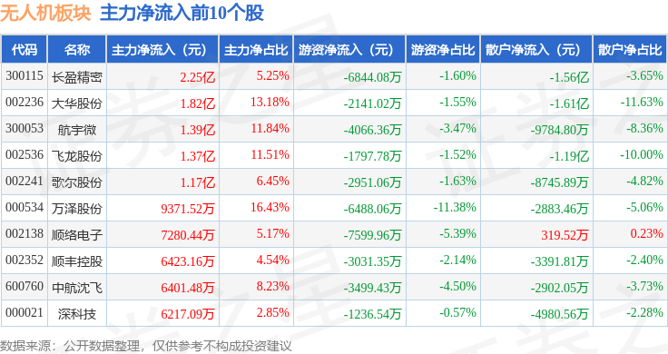 从资金流向上来看,当日无人机板块主力资金净流出1.78亿元,游资资金净流出1.53亿元,散户资金净流入3.32亿元。无人机板块个股资金流向见下表: