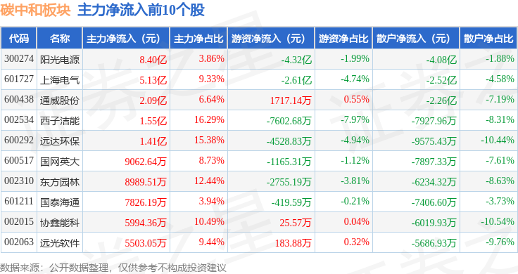 从资金流向上来看,当日碳中和板块主力资金净流入5.14亿元,游资资金净流出5.32亿元,散户资金净流入1781.4万元。碳中和板块个股资金流向见下表: