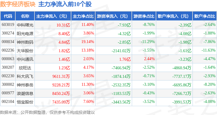 从资金流向上来看,当日数字经济板块主力资金净流出27.88亿元,游资资金净流出7.54亿元,散户资金净流入35.43亿元。数字经济板块个股资金流向见下表:
