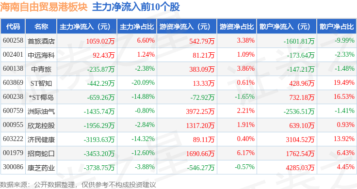 从资金流向上来看,当日海南自由贸易港板块主力资金净流出22.86亿元,游资资金净流入6.14亿元,散户资金净流入16.71亿元。海南自由贸易港板块个股资金流向见下表: