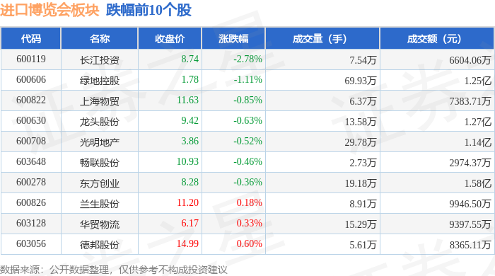 证券之星消息,11月6日进口博览会板块较上一交易日下跌0.05%,长江投资领跌。当日上证指数报收于4007.76,上涨0.97%。深证成指报收于13452.42,上涨1.73%。进口博览会板块个股涨跌见下表: