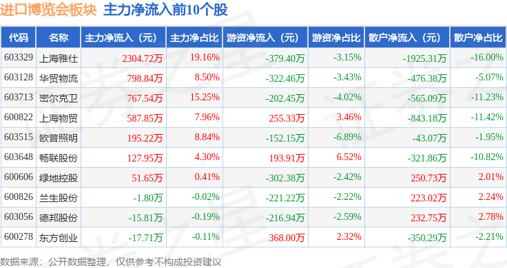 从资金流向上来看,当日进口博览会板块主力资金净流入3017.18万元,游资资金净流出592.07万元,散户资金净流出2425.11万元。进口博览会板块个股资金流向见下表: