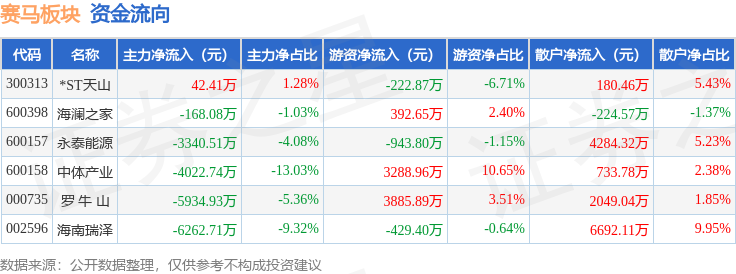 从资金流向上来看,当日赛马板块主力资金净流出1.97亿元,游资资金净流入5971.43万元,散户资金净流入1.37亿元。赛马板块个股资金流向见下表: