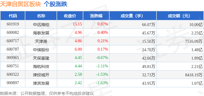 证券之星消息,11月6日天津自贸区板块较上一交易日上涨0.59%,中远海控领涨。当日上证指数报收于4007.76,上涨0.97%。深证成指报收于13452.42,上涨1.73%。天津自贸区板块个股涨跌见下表: