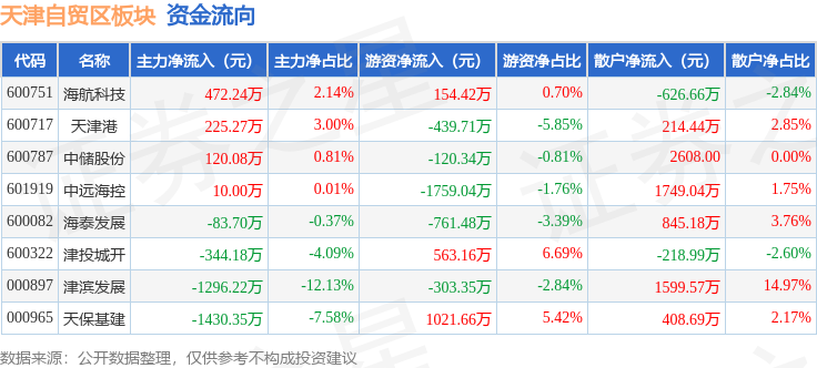 从资金流向上来看,当日天津自贸区板块主力资金净流出2326.86万元,游资资金净流出1644.68万元,散户资金净流入3971.54万元。天津自贸区板块个股资金流向见下表: