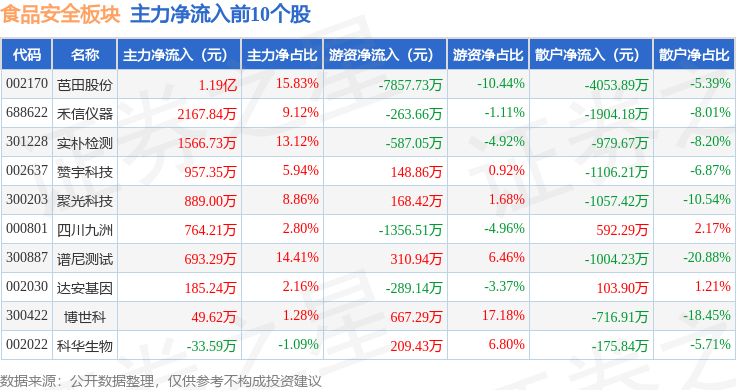 从资金流向上来看,当日食品安全板块主力资金净流出2.15亿元,游资资金净流出1.4亿元,散户资金净流入3.54亿元。食品安全板块个股资金流向见下表: