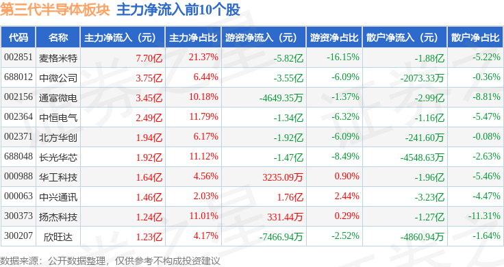 从资金流向上来看,当日第三代半导体板块主力资金净流入23.73亿元,游资资金净流出14.51亿元,散户资金净流出9.23亿元。第三代半导体板块个股资金流向见下表: