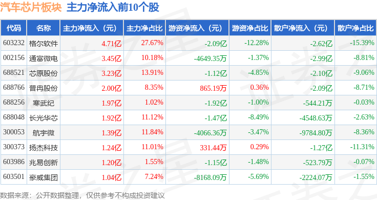 从资金流向上来看,当日汽车芯片板块主力资金净流入25.64亿元,游资资金净流出8.64亿元,散户资金净流出17.01亿元。汽车芯片板块个股资金流向见下表: