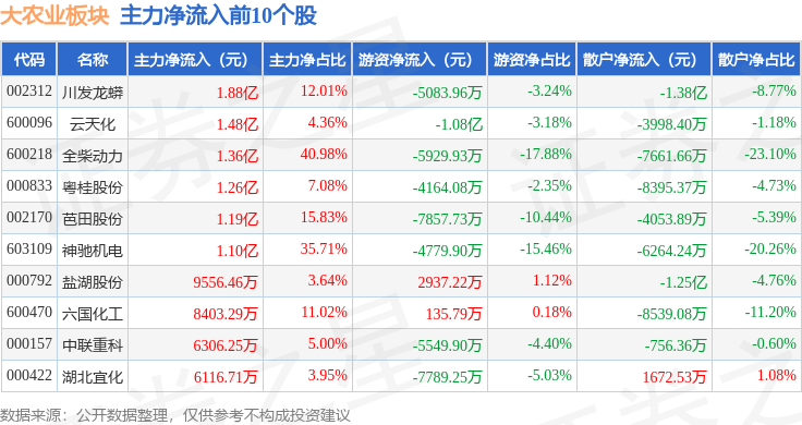 从资金流向上来看,当日大农业板块主力资金净流入2.29亿元,游资资金净流出3.44亿元,散户资金净流入1.15亿元。大农业板块个股资金流向见下表: