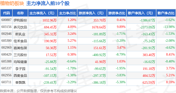 从资金流向上来看,当日植物奶板块主力资金净流出8812.52万元,游资资金净流入2422.2万元,散户资金净流入6390.32万元。植物奶板块个股资金流向见下表: