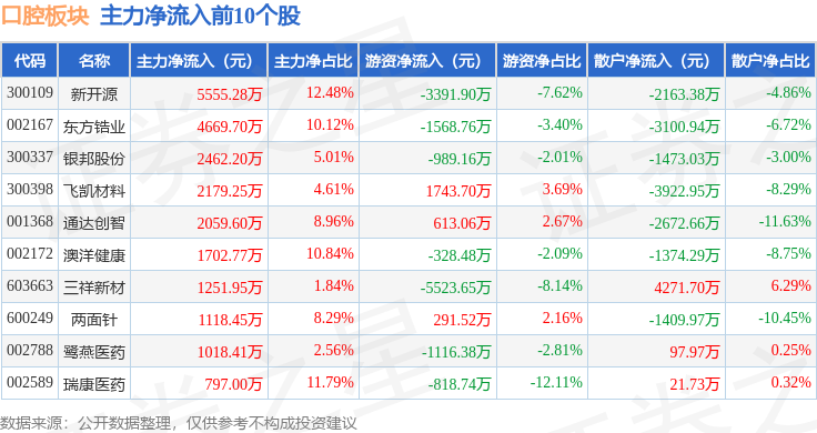 从资金流向上来看,当日口腔板块主力资金净流出4.39亿元,游资资金净流入1.09亿元,散户资金净流入3.3亿元。口腔板块个股资金流向见下表: