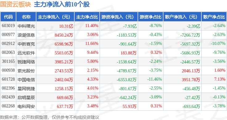 从资金流向上来看,当日国资云板块主力资金净流入4.29亿元,游资资金净流出8.28亿元,散户资金净流入3.98亿元。国资云板块个股资金流向见下表:
