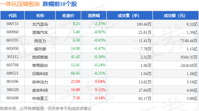 证券之星消息,11月6日一体化压铸板块较上一交易日上涨1.95%,长源东谷领涨。当日上证指数报收于4007.76,上涨0.97%。深证成指报收于13452.42,上涨1.73%。一体化压铸板块个股涨跌见下表: