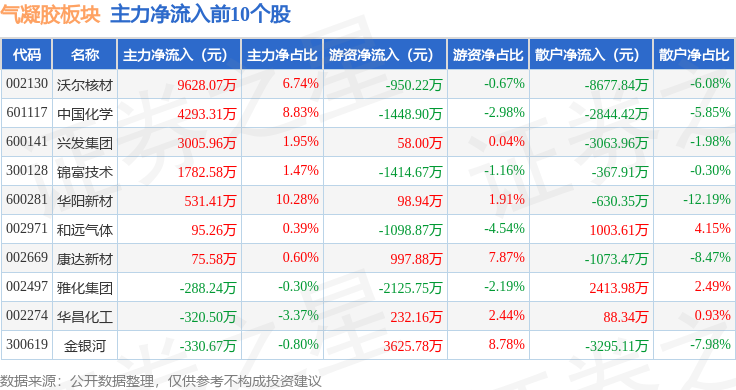 从资金流向上来看,当日气凝胶板块主力资金净流入1.25亿元,游资资金净流出956.04万元,散户资金净流出1.16亿元。气凝胶板块个股资金流向见下表: