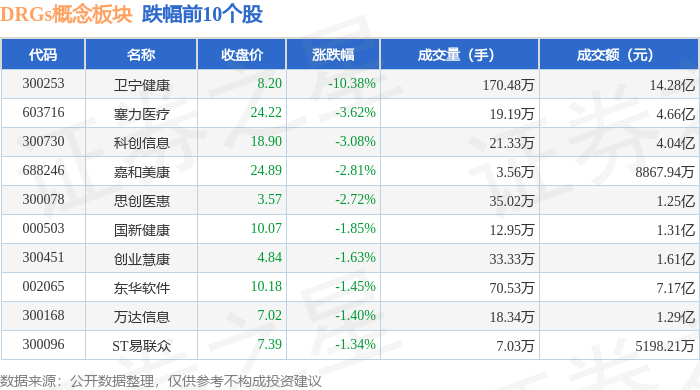 证券之星消息,11月6日DRGs概念板块较上一交易日下跌1.71%,卫宁健康领跌。当日上证指数报收于4007.76,上涨0.97%。深证成指报收于13452.42,上涨1.73%。DRGs概念板块个股涨跌见下表: