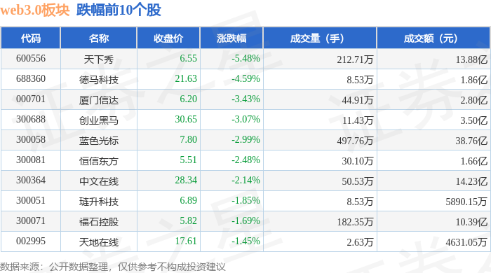 证券之星消息,11月6日web3.0板块较上一交易日下跌0.96%,天下秀领跌。当日上证指数报收于4007.76,上涨0.97%。深证成指报收于13452.42,上涨1.73%。web3.0板块个股涨跌见下表: