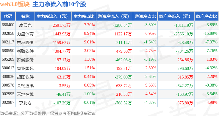 从资金流向上来看,当日web3.0板块主力资金净流出12.44亿元,游资资金净流入1.55亿元,散户资金净流入10.88亿元。web3.0板块个股资金流向见下表: