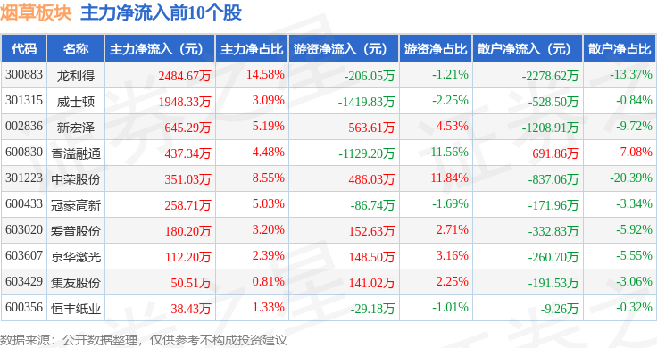 从资金流向上来看,当日烟草板块主力资金净流出3.81亿元,游资资金净流入1.3亿元,散户资金净流入2.51亿元。烟草板块个股资金流向见下表: