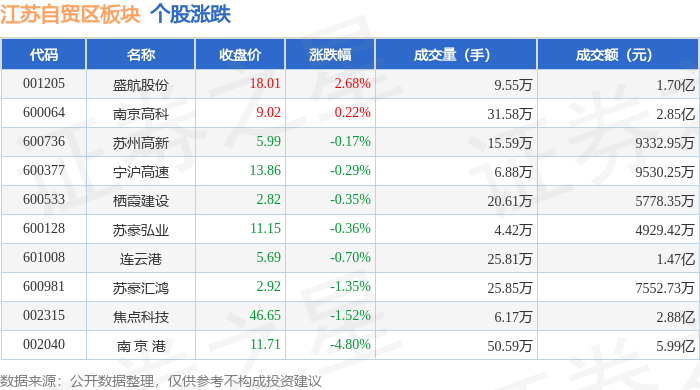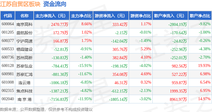 从资金流向上来看,当日江苏自贸区板块主力资金净流出8589.13万元,游资资金净流出1337.22万元,散户资金净流入9926.36万元。江苏自贸区板块个股资金流向见下表: