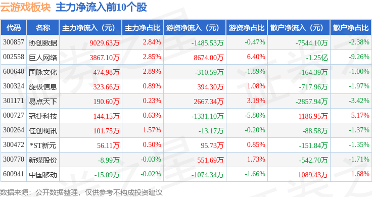 从资金流向上来看,当日云游戏板块主力资金净流出13.67亿元,游资资金净流入4.62亿元,散户资金净流入9.05亿元。云游戏板块个股资金流向见下表: