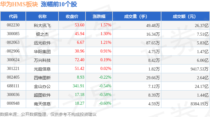 证券之星消息,11月6日华为HMS板块较上一交易日下跌0.29%,卫宁健康领跌。当日上证指数报收于4007.76,上涨0.97%。深证成指报收于13452.42,上涨1.73%。华为HMS板块个股涨跌见下表: