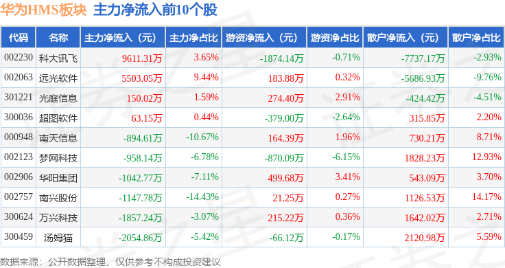 从资金流向上来看,当日华为HMS板块主力资金净流出5.67亿元,游资资金净流入2.52亿元,散户资金净流入3.15亿元。华为HMS板块个股资金流向见下表: