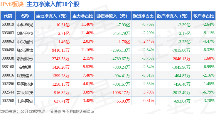 从资金流向上来看,当日IPv6板块主力资金净流入14.58亿元,游资资金净流出6.87亿元,散户资金净流出7.71亿元。IPv6板块个股资金流向见下表: