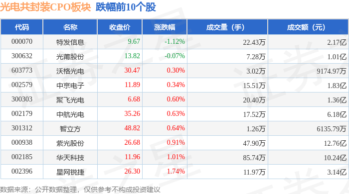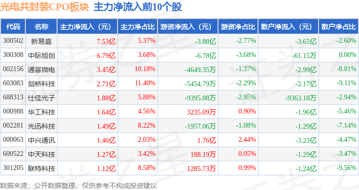 从资金流向上来看,当日光电共封装CPO板块主力资金净流入34.02亿元,游资资金净流出12.84亿元,散户资金净流出21.18亿元。光电共封装CPO板块个股资金流向见下表: