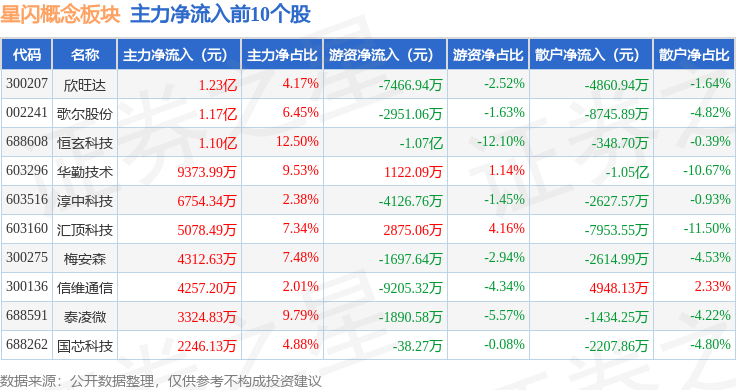 从资金流向上来看,当日星闪概念板块主力资金净流出1.91亿元,游资资金净流入2184.87万元,散户资金净流入1.69亿元。星闪概念板块个股资金流向见下表:
