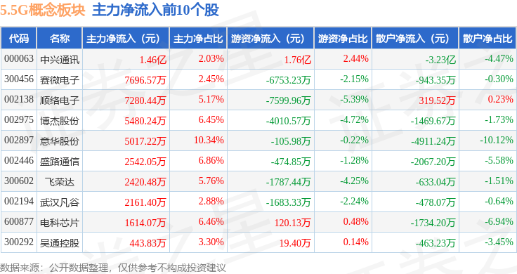 从资金流向上来看,当日5.5G概念板块主力资金净流入4.24亿元,游资资金净流出2226.0万元,散户资金净流出4.02亿元。5.5G概念板块个股资金流向见下表: