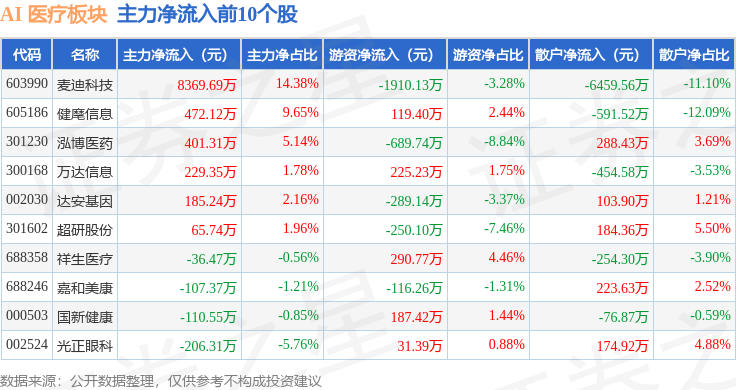 从资金流向上来看,当日AI 医疗板块主力资金净流出5.47亿元,游资资金净流入1.83亿元,散户资金净流入3.64亿元。AI 医疗板块个股资金流向见下表: